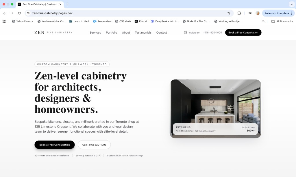 Zen Fine Cabinetry needed a professional online presence that reflected their zen-level craft and made it easy for architects, designers, and homeowners to book consultations and see past work.